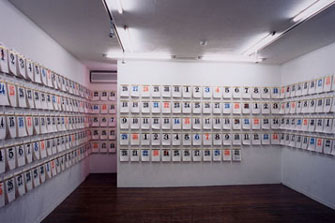 工業製品や量産品を解体、再構成し、日常生活におけるそれらの意味や用途を無効にする。 これまで、カレンダー、クーラー、テーブル、ドア、食器などを用いた試みをしてきた。 本来の見なれた姿をとどめつつ無用物となった「製品」は、別の事物や出来事の意味の引用を可能にしながら、溝江と鑑賞者が、問いの答へ向かう体験 を共有する。 " Untitled/Hierarchical Goals " at VOICE GALLERY, 2002 -バスケットゴール、バスケットボール、その他/basket goal, ball, etc. -W4200 x H2550 x D5000mm " Untilted/365 times a day " at VOICE GALLERY, 2001 -同日の日めくりカレンダー365枚 (1日分) x 365冊 (1年分)/ 365 pieces of one calendar day x 365 set -W190 x H325 x D22mm:each " Untitled/Circulation Blues " at Kobe Art Village Center, 2001 -エアコン、トレイ/air conditioner set, tray -W35 x D193 x H15mm (L), W24 x D136 x H10.5mm (S) ■略 歴 1974年 大分県生まれ 1999年 嵯峨美術短期大学専攻科修了 2000年 嵯峨美術短期大学研究生修了 ■活動歴 ー個 展 2002年 " Untitled/Hierarchical Goals " (ヴォイス・ギャラリー) 2001年 " Untitled/365 times a day " (ヴォイス・ギャラリー) 2000年 " UNTITLED / SHOWROOM " (京都市四条ギャラリー/京都) 1999年 ヴォイス・ギャラリー ーグループ展 2001年 ・神戸アートアニュアル2001「ねむい、まぶた」(神戸アートビレッジセンター/神戸) ・art in transit (ザ・パレスサイドホテル/京都) ・INDEX (ヴォイス・ギャラリー/京都) 1999年 ・「タブラ・ラサ」(京都市四条ギャラリー/京都) ▲TOP / BACK |