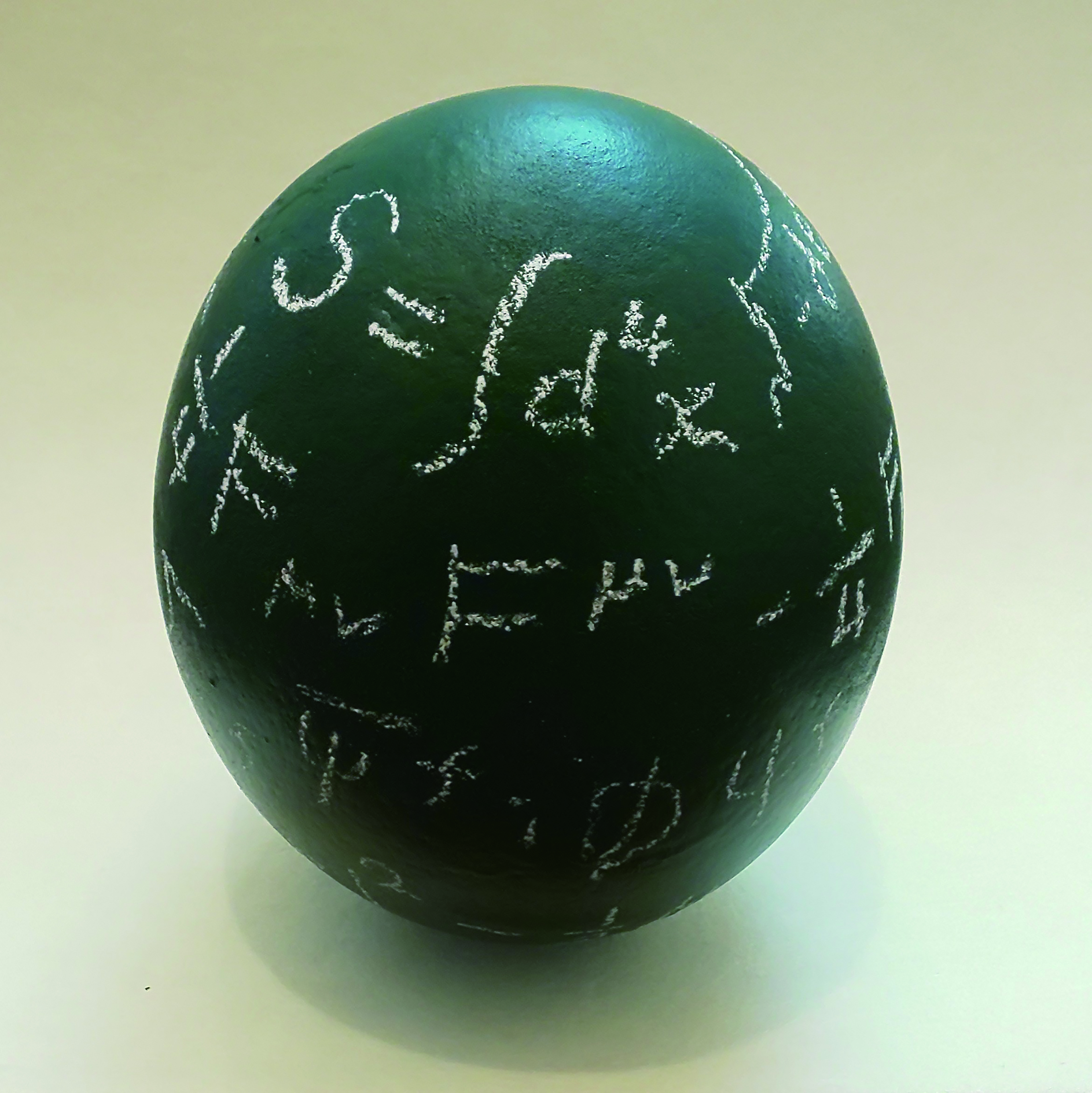 宇宙の原初が卵であるとする卵生神話は世界に遍在しており、卵が持つ球形は万物の始原を象徴するイメージである。球形の黒板(ダチョウ卵殻)に、宇宙の全てを支配する数式である標準模型の数式を記述。