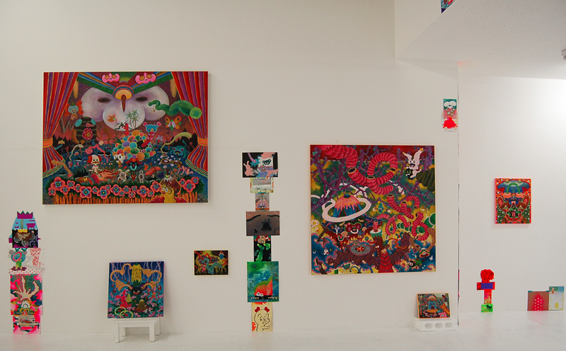 展覧会「有毒女子」展示風景 キャンバス・油彩、コラージュ、油性インク、紙など 2010年